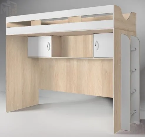 Для подъема на второй ярус предусмотрена узкая вертикальная лестница с металлическими перекладинами. Есть возможность докупить лестницу в виде тумбы. Под спальным ложем предусмотрена полка с закрытыми ящичками и открытой центральной секцией для книг и игрушек глубиной 22 см. Размер ниши под спальным местом 1830 мм. Кровать собирается как на правую, так и на левую сторону.