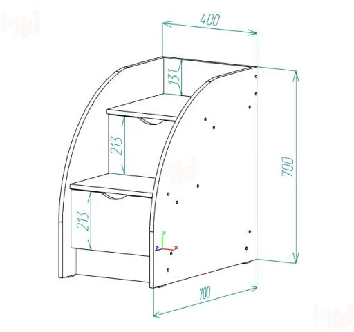 - Лестница-комод 13/19СВ представляет собой модуль из двух ступеней с ящиками. Размер: 400х800х700 мм.