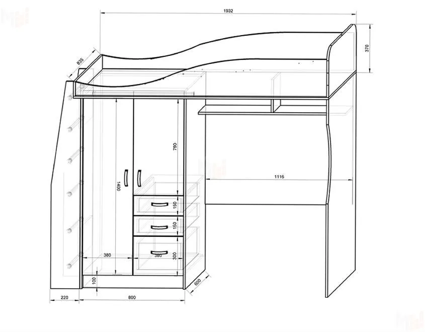 - кровать-чердак 4/1 со спальным местом 1900х800 мм на верхнем ярусе (основанием является здесь лист ДСП, бортик-ограничитель по всему периметру второго этажа), встроенным шкафом (металлическая штанга и выдвижные ящики справа) и полками для книг (два элемента в конструктиве).