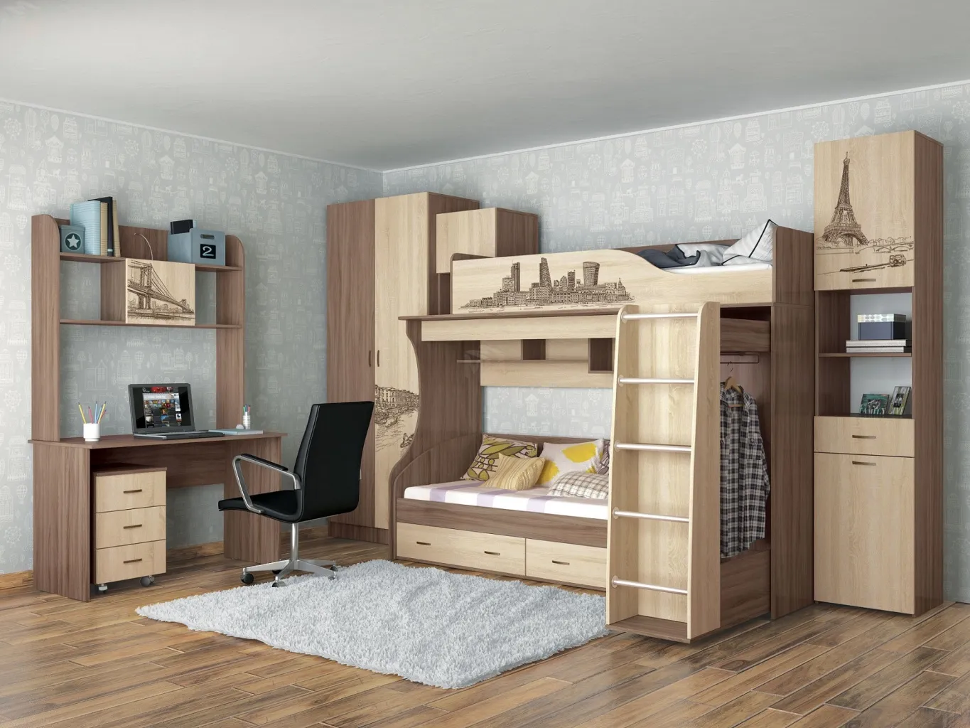 Односпальная кровать-чердак Орион станет украшением и удобным местом отдыха в детской комнате. Функциональность и комфорт - все это позволяет подчеркнуть элегантность и завершенный вид модели. Спокойные и расслабляющие оттенки мебели придутся по душе ценителям комфортного безмятежного отдыха. Кровать оснащена штангой для хранения одежды на вешалках, открытыми и закрытыми нишами, четырьмя открытыми полками. -