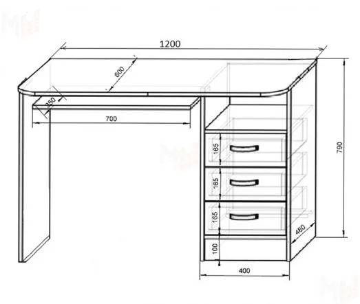 - Письменный стол для учебы. Состоит из встроенной тумба с тремя ящиками и выкатной полкой.