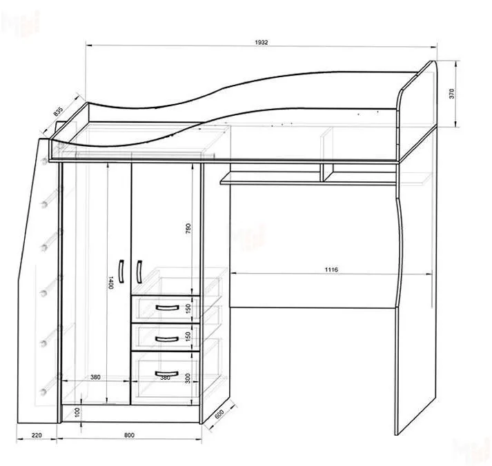 - Кровать-чердак представляет собой удобное спальное место размером 1900х800 мм и бортиком. Основание - лист ДСП. Наполнение: двухдверный шкаф, встроенная лестница и навесная полка для книг.