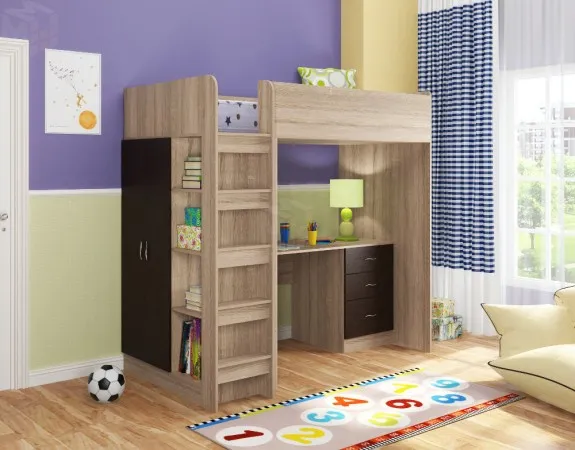 Кровать-чердак Теремок-3 представляет собой самодостаточный комплекс включающий в себя зону для сна, шкаф и полноценный рабочий стол. Прочная конструкция рассчитана на детей от 3 до 16 лет. Такая детская обеспечит разумную экономию пространства в вашем доме и полностью обеспечит выполнение всех многообразных функций детской и подростковой комнаты.