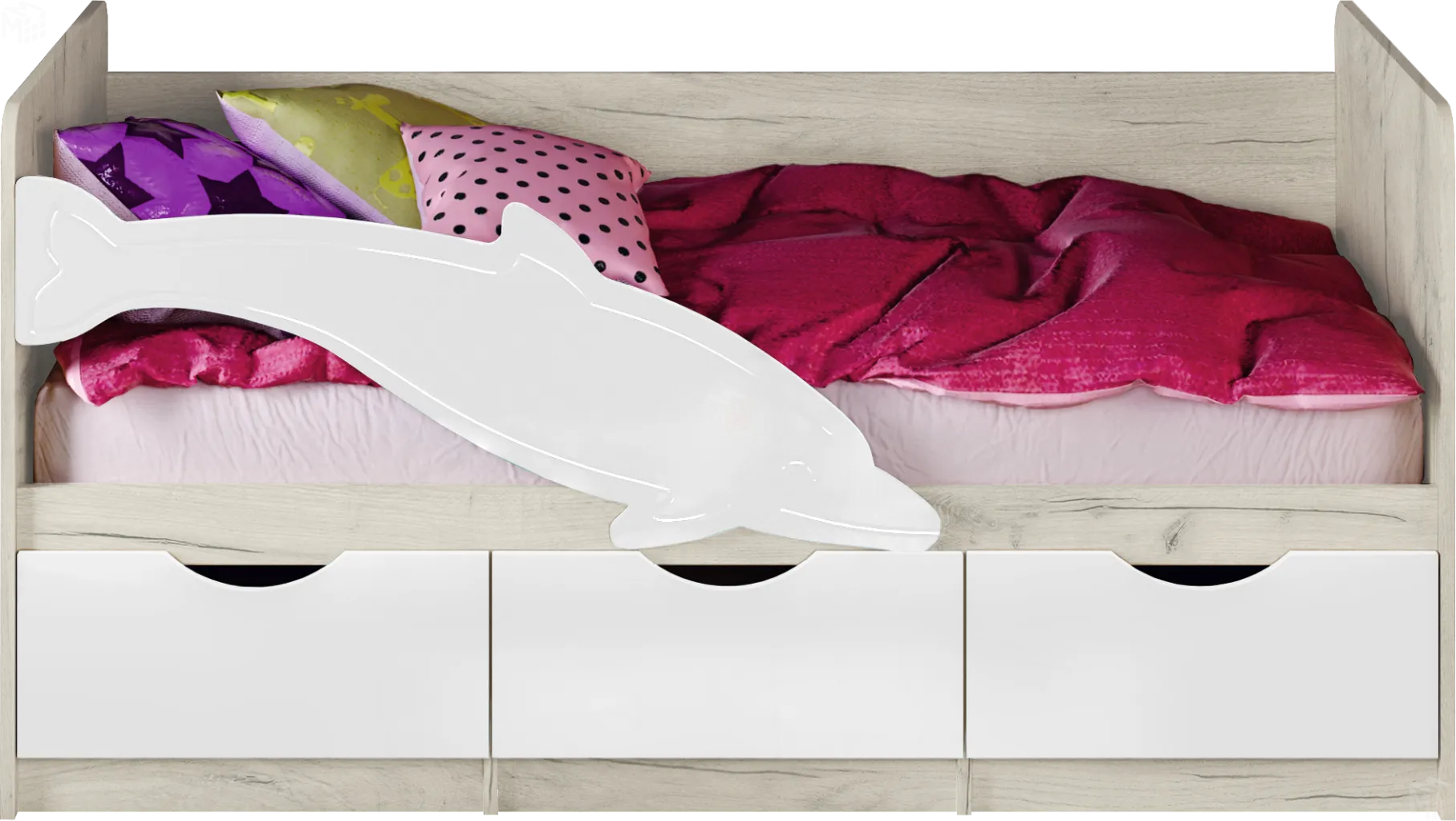 Детская кровать Дельфин - отличное решение для детской комнаты. Фасад кровати оформлен панелью с рельефным изображением дельфина. Кроме декоративной, он несет также защитную функцию – предотвращает возможность падения ребенка на пол во время сна.