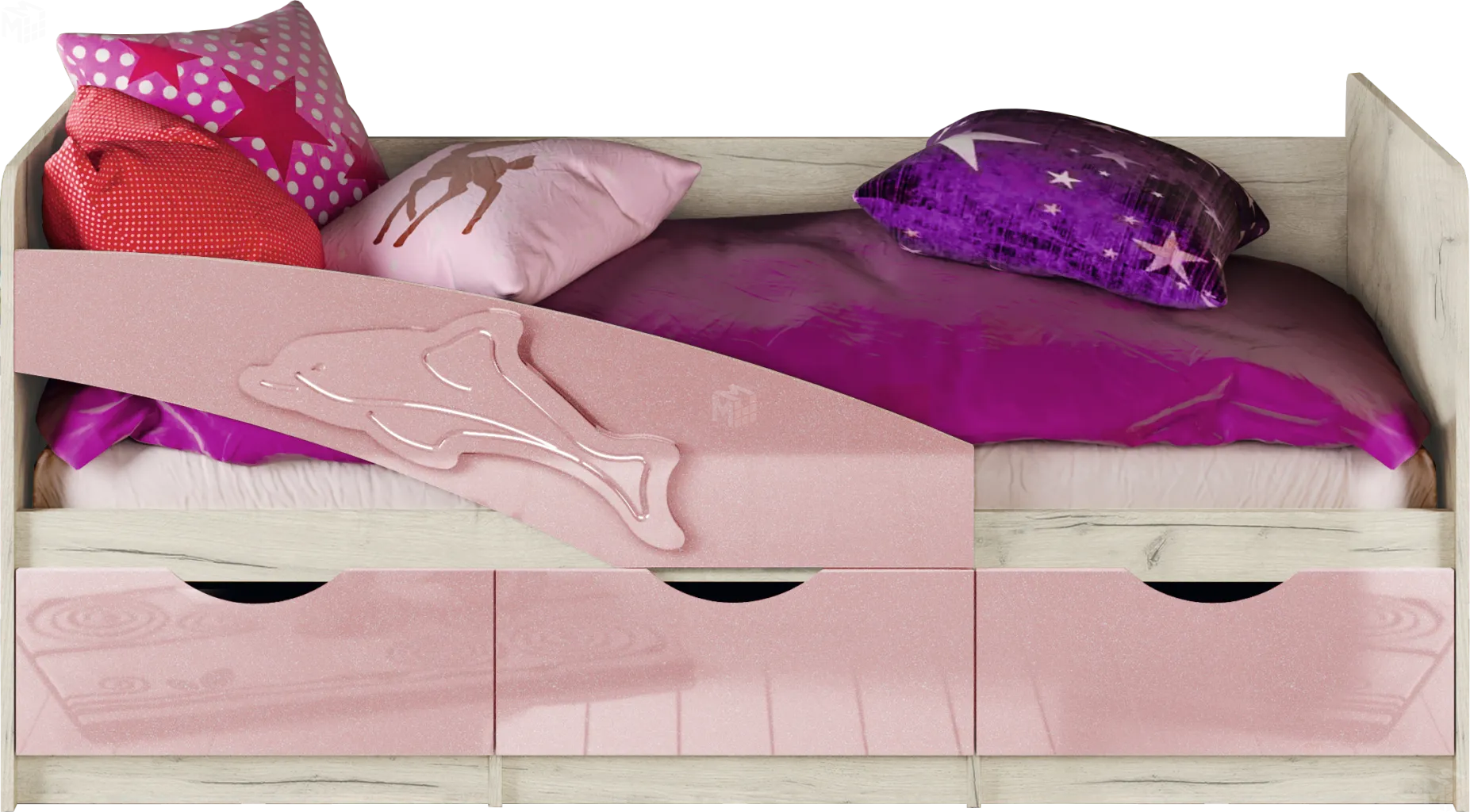 Детская кровать Дельфин - отличное решение для детской комнаты. Фасад кровати оформлен панелью с рельефным изображением дельфина. Кроме декоративной, он несет также защитную функцию – предотвращает возможность падения ребенка на пол во время сна.