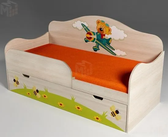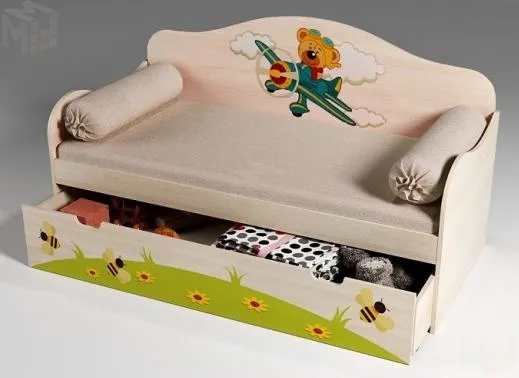 Представляет собой удобное спальное место с высокими спинкой, боковинами и основанием - лист ДСП, а также вместительный выкатной ящик на колесиках (не крепится к модулю, поделен на два отдела для функционального хранения белья или игрушек).