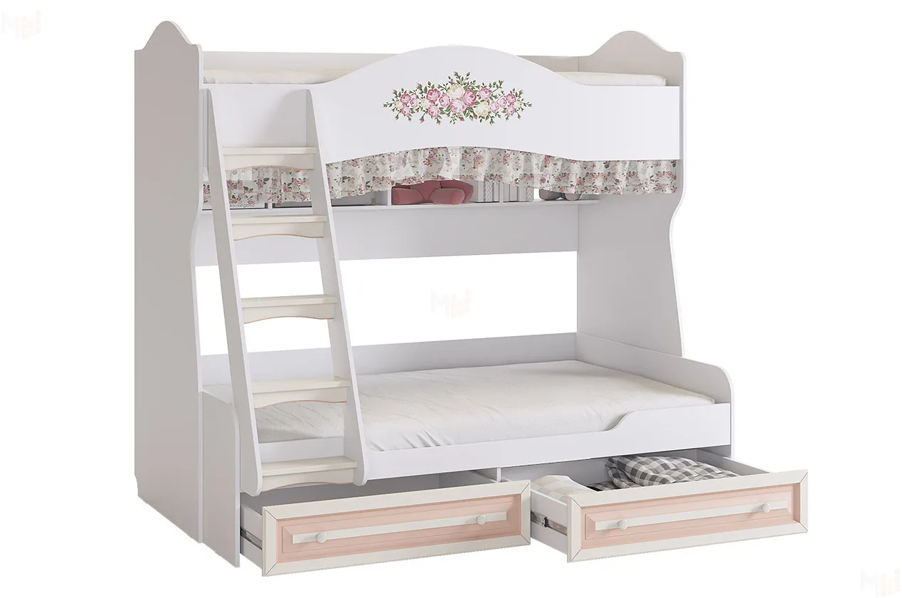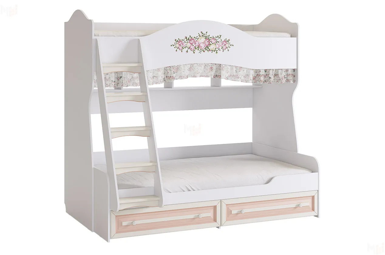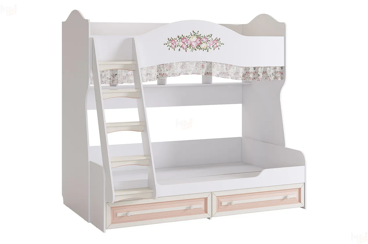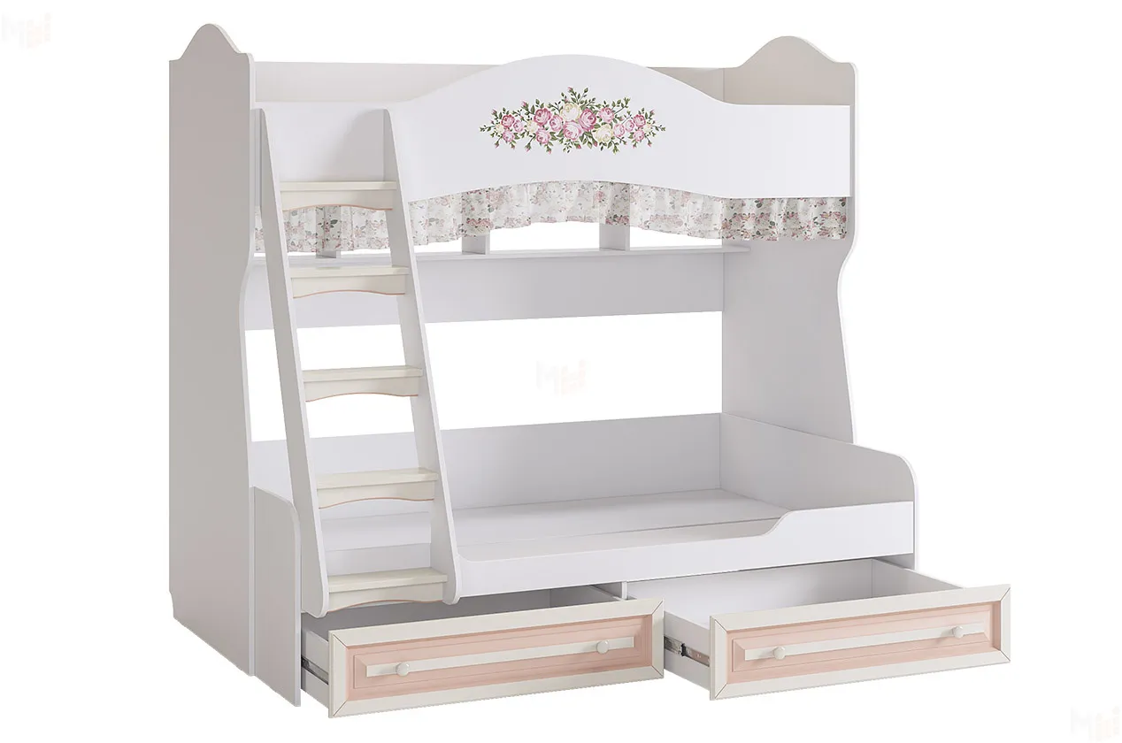2-ярусная кровать из серии «Алиса» – компактный и изысканный уголок Франции в Вашем доме! Кровать выполнена в нежных цветах: белый, крем и розовый. Фасадные элементы выполнены из крашеного МДФ и украшены классической фрезеровкой с патиной и рисунком из роз. 2-ярусная «Алиса» предусматривает два спальных места: нижнее, для матраса размером 1200х1900 мм, и верхнее – 800х1900 мм. Комплектуется удобной безопасной лестницей, на ступенях антискользящее покрытие. В «Алисе» достаточно мест для хранения игрушек: удобные полки декорированы легкой съемной шторкой, и вместительные выдвижные ящики.