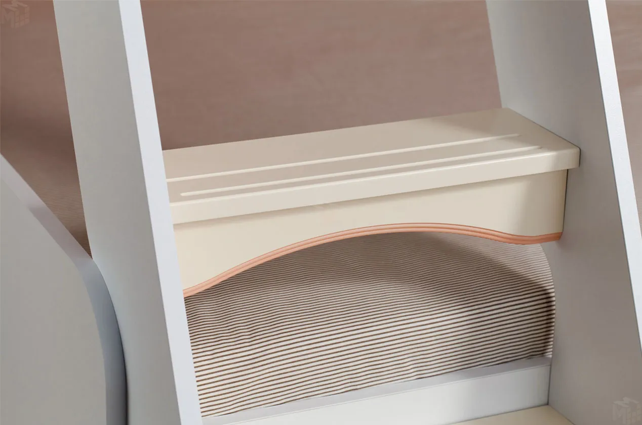 Состоит из: 2-х спальных мест, 2-х выдвижных ящиков для игрушек, полок, декоративной шторки, лестницы.