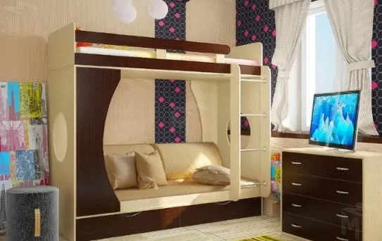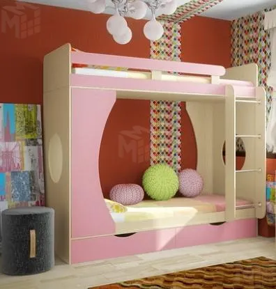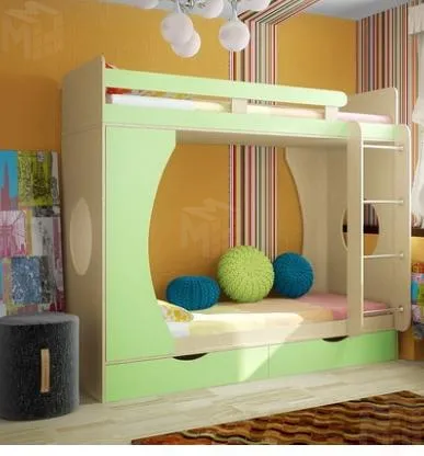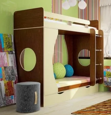 К данной кровати вы можете докупить шкаф, комод, письменный стол, полки. Круглое отверстие в боковинах позволяет проникать дневному свету на первый ярус, что делает нижнее спальное место светлее. Для удобства вы можете докупить лестницу-комод.