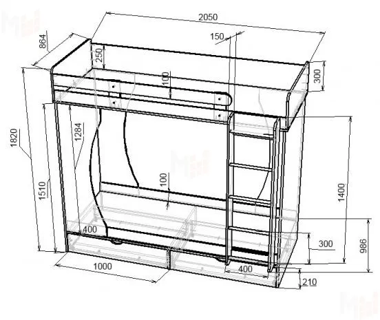 Расстояние от нижнего спального места до верхнего 1284 мм.