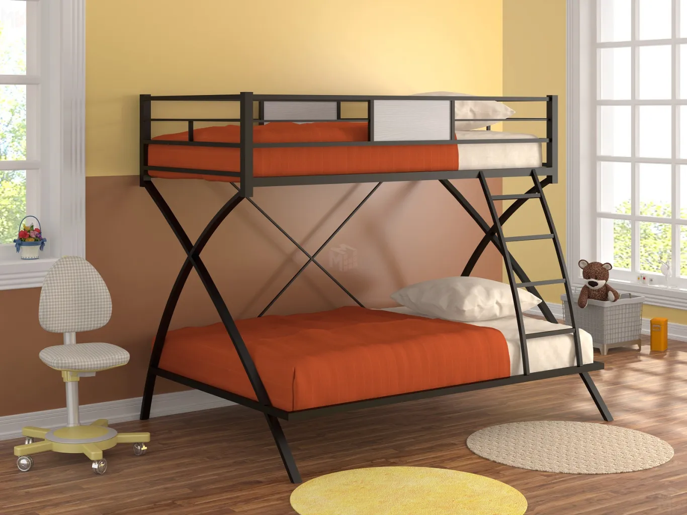 Кровать подойдет как детям с разницей в возрасте, так и погодкам, поскольку верхний ярус оснащен надежным бортиком, защищающим обитателя второго этажа от падения во сне. Нижнее спальное место немного шире верхнего, что придает устойчивость всей конструкции.