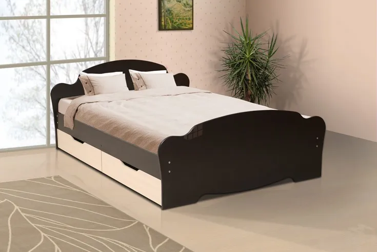 Каркас кровати выполнен из ЛДСП, в стоимость входят 2 выдвижных ящика, которые размещаются под кроватью.