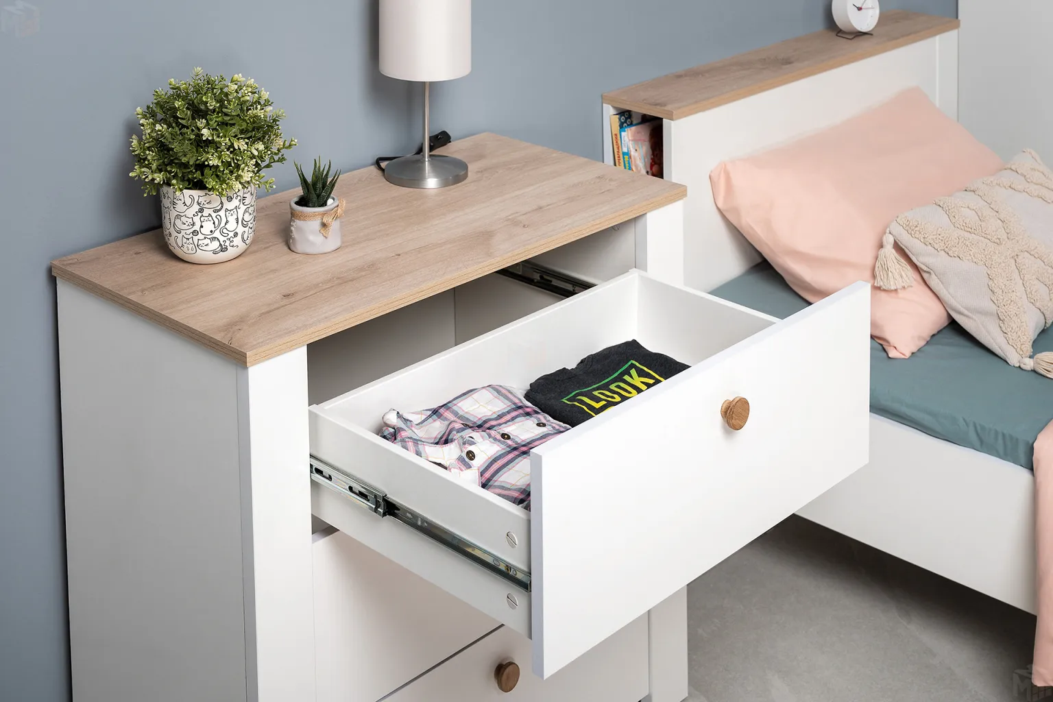 Кровать 11.54 Джастин имеет интересную конструкцию. Функциональная ниша в спинке кровати. Визитная карточка коллекции – лицевая фурнитура из натурального массива дуба. -