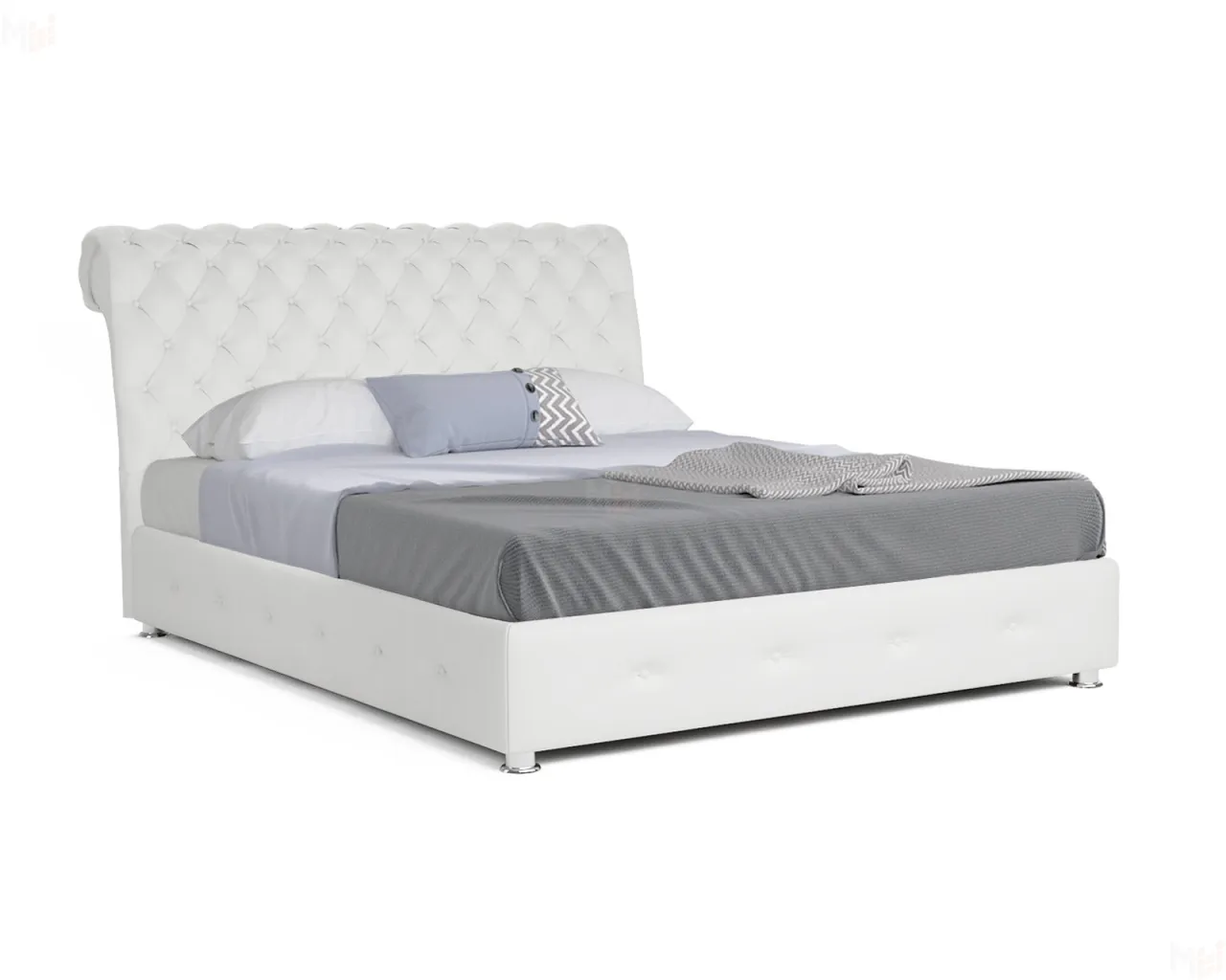 Обивка кровати выполнена из экокожи белого цвета, а высокое изголовье отделано по принципу каретной стяжки.
