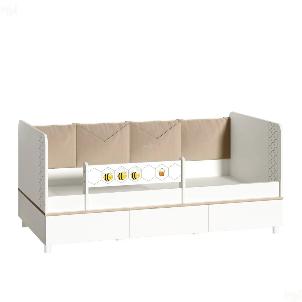 Кровать оснащена съёмным мягким элементом с карманами, передвижным бортиком и декорирована оригинальным рисунком - мультяшными пчёлками, которые никого не оставят равнодушным. Съёмный мягкий элемент с карманым бортиком