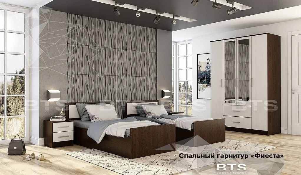 Удобная односпальная кровать с основанием из ЛДСП, выполненная из ламинированной плиты цвета «венге» и с декором изголовья в цвете «лоредо».