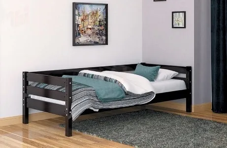 Кровать из массива сосны, окрашена в цвет орех темный. Спальное место 90*200 см. Матрас приобретается дополнительно.
