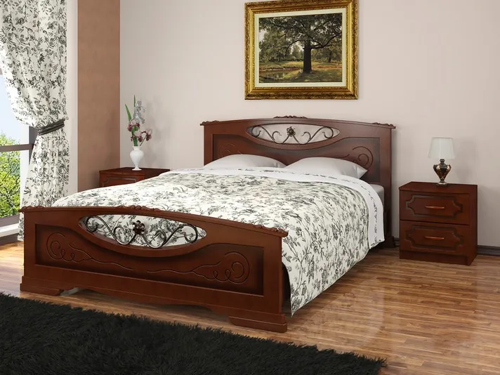 Кровать из массива сосны Елена-5 декорирована элементами художественной ковки. Высота спального места 425 мм. Размер спального места 120*200 см. В стоимость входит ортопедическое деревянное основание под матрас.
