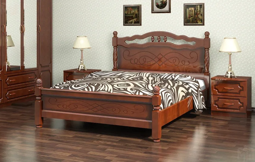 Кровать Карина-15 выполнена из массива сосны, спинка с элементами МДФ. Кровать декорирована в цвет орех. Кровать может быть дополнена прикроватными тумбами, комодом, шкафами в едином стиле. Спальное место 140*200 см. Ортопедическое основание под матрас входит в стоимость.