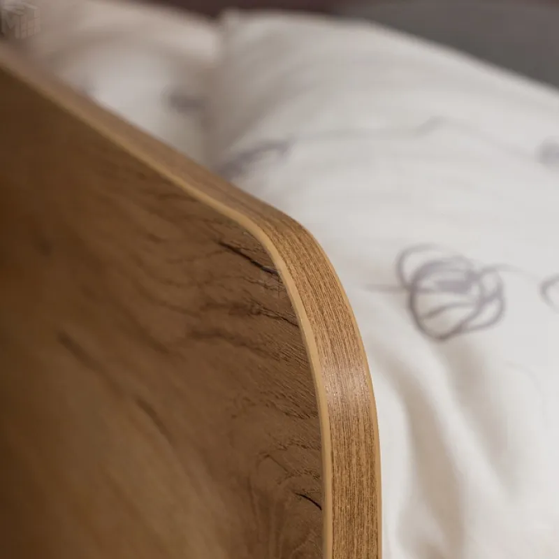 Обратите внимание, что изножье совсем не высокое и не будет мешать садиться на кровать даже с этой стороны, поэтому кровать можно ставить не только у стены. Кроватный ящик открывается за ручку-карман. Такой импровизированный карман дает возможность аккуратно сложить необходимые перед сном вещи: книгу, телефон, любимую игрушку.
