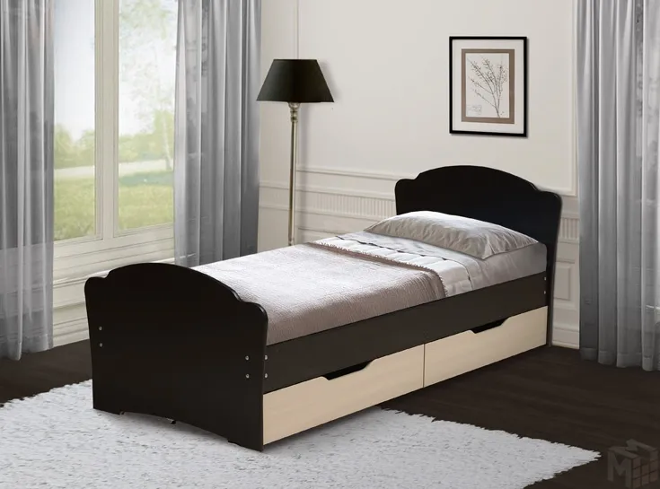 Кровать с низкой ножной спинкой выполнена из ЛДСП, в комплект входят 2 выдвижных ящика на выкатных роликах. Размер спального места 90*200 см. Матрас приобретается дополнительно.