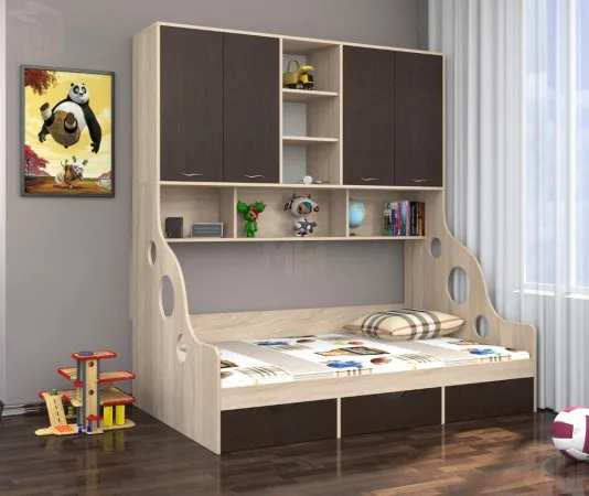 Кровать с антресолью Дельта - 21.11 представляет собой функциональный комплекс, совмещающий в себе расширенное спальное место с блоком вместительных антресолей, удобных для хранения книг, предметов декора, игрушек и других личных вещей. Антресоль состоит из трех открытых и шести закрытых за распашными дверями ниш. Внизу расположены три выкатных ящика, в которых можно хранить постельное белье или одежду. Этот комплекс можно успешно скомплектовать с другими подходящими элементами корпусной мебели серии Дельта.