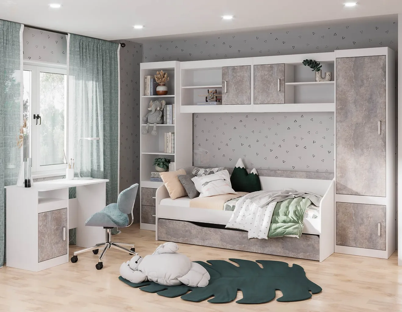 Кровать с закругленными углами и с выкатным ящиком на роликовой опоре, который можно использовать как дополнительное спальное место, так и как место для хранения вещей.