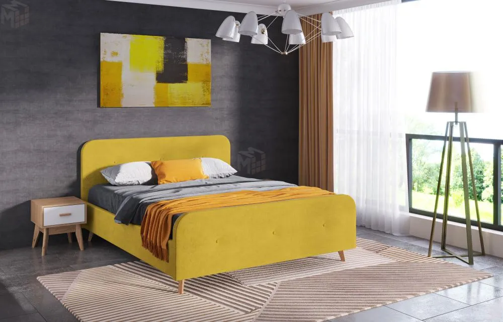 Изголовье имеет закругленный силуэт, обтянут велюровой тканью с пуговицами, что обеспечивает дополнительную мягкость и уют. Высокие стильные ножки из массива березы создадут ощущение легкости и воздушности.