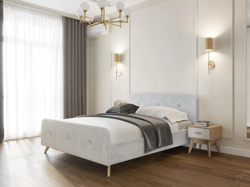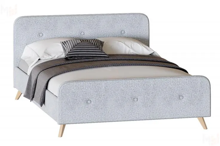 Изголовье имеет закругленный силуэт, обтянут велюровой тканью с пуговицами, что обеспечивает дополнительную мягкость и уют. Высокие стильные ножки из массива березы создадут ощущение легкости и воздушности.