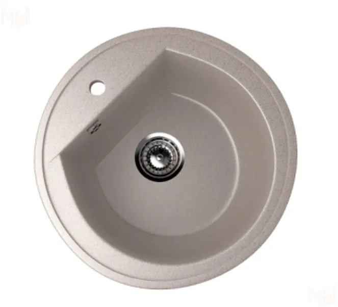 Круглая мойка из искусственного камня. Модель Ulgran U-103. С отверстием под смеситель. Благодаря особой геометрии чаши с прямой стенкой со стороны смесителя, модель отлично подходит для тех, кто использует как круглые, так и прямоугольные тарелки. Благодаря такой необычной форме, распределение грязной посуды по мойке становится более компактным.