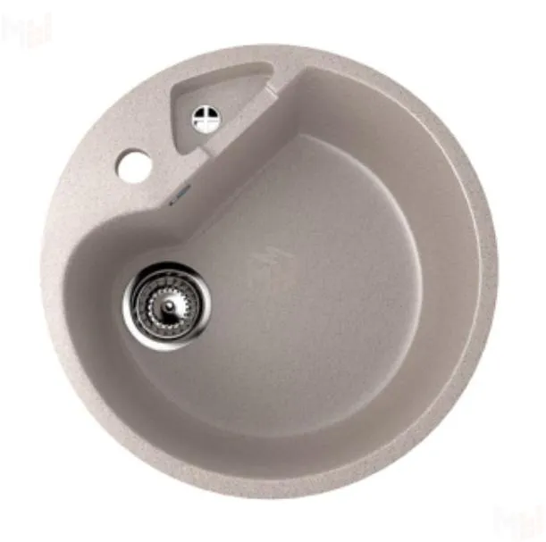 Круглая мойка из искусственного камня с двумя чашами. Ulgran-U108. Эта компактная модель обладает дополнительной секцией, в которую можно положить небольшие предметы для сушки. Также эта секция может использоваться для разморозки. Очень компактная и эргономичная модель которая идеально подойдет для маленькой кухни.Следует учесть, что дополнительная секция используется также в качестве переливного отверстия.