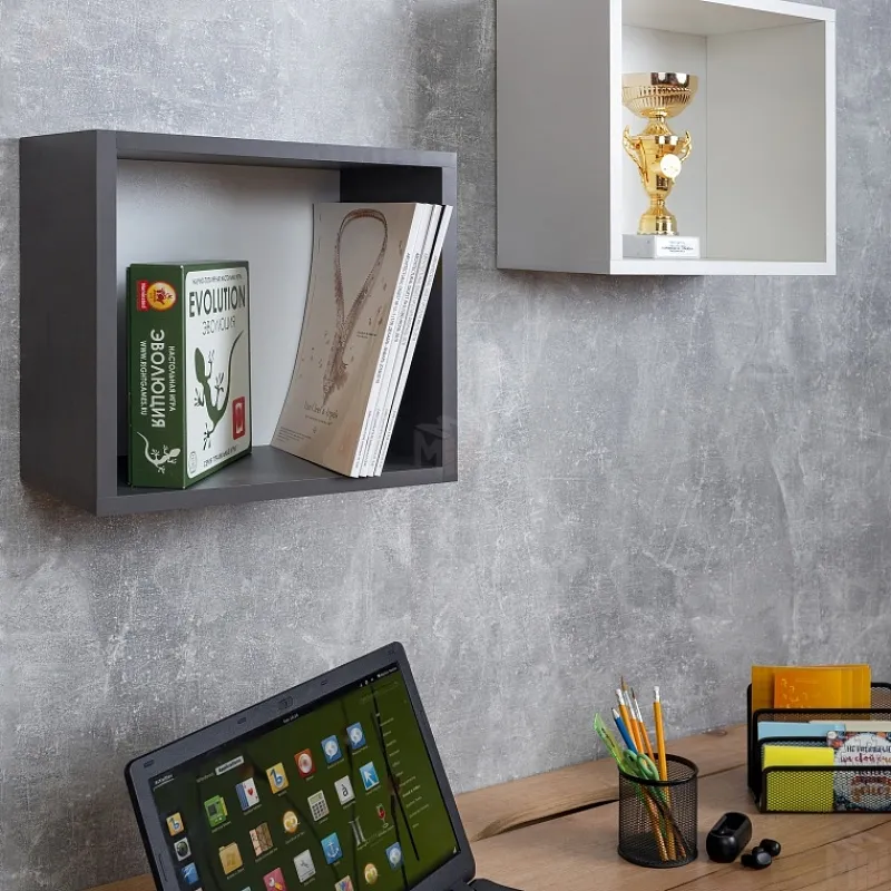 Декоративный куб в декорах Белый, Дуб Золотистый и Графит с белой задней стенкой можно использовать как навесную полку для книг и для декорирования интерьера. ЛОЙС 98 Куб 1 - оригинальное решение для декора комнаты подростка.