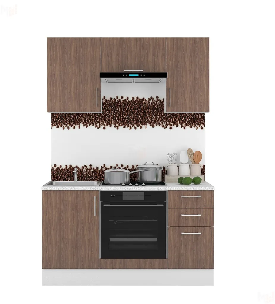 Корпус ЛДСП белый, фасады ЛДСП Ясень таормино. Ножки кухни скрыты цоколем ЛДСП.