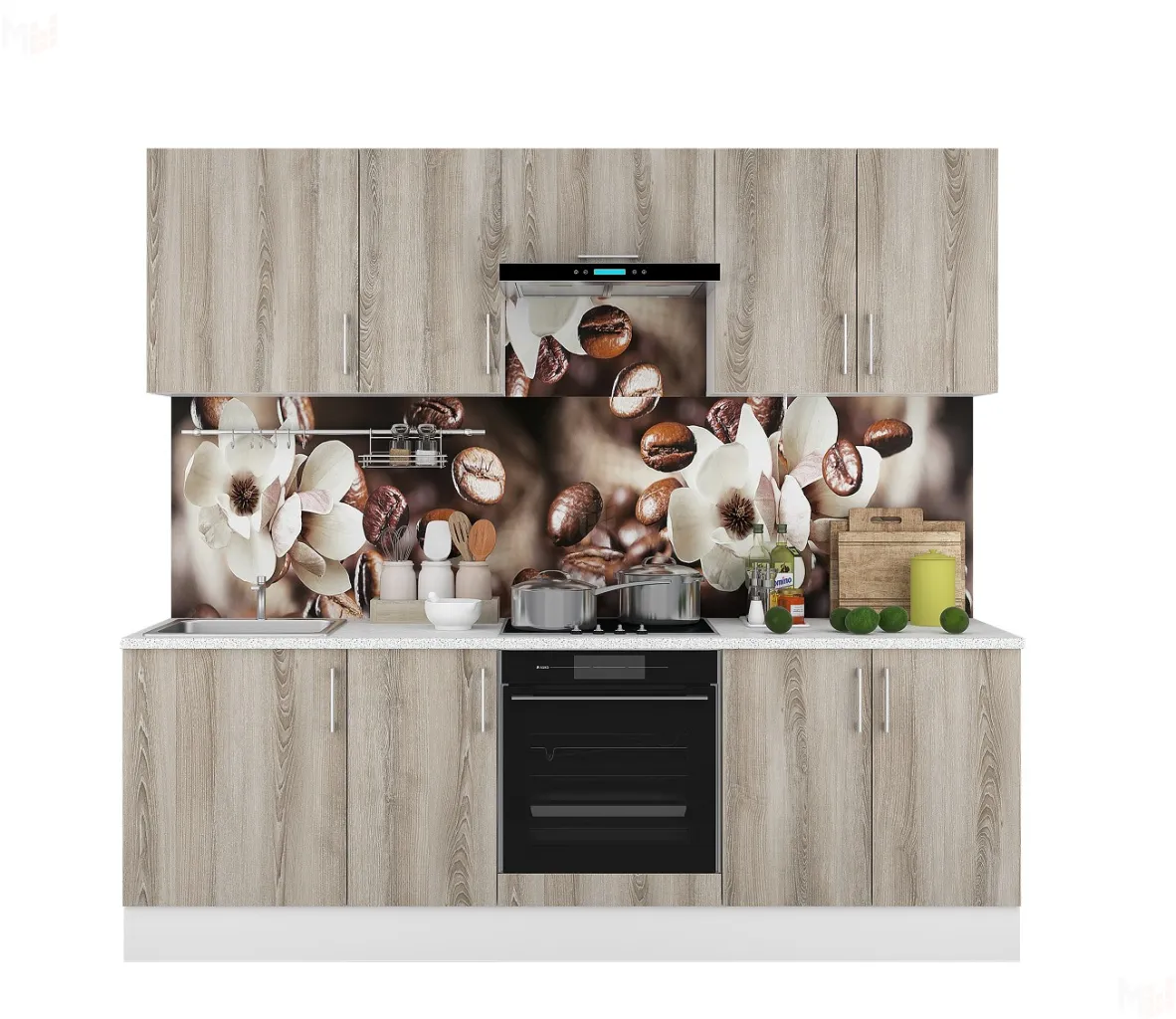 Корпус ЛДСП белый, фасады ЛДСП Ясень таормино. Ножки кухни скрыты цоколем ЛДСП высотой 150 см.