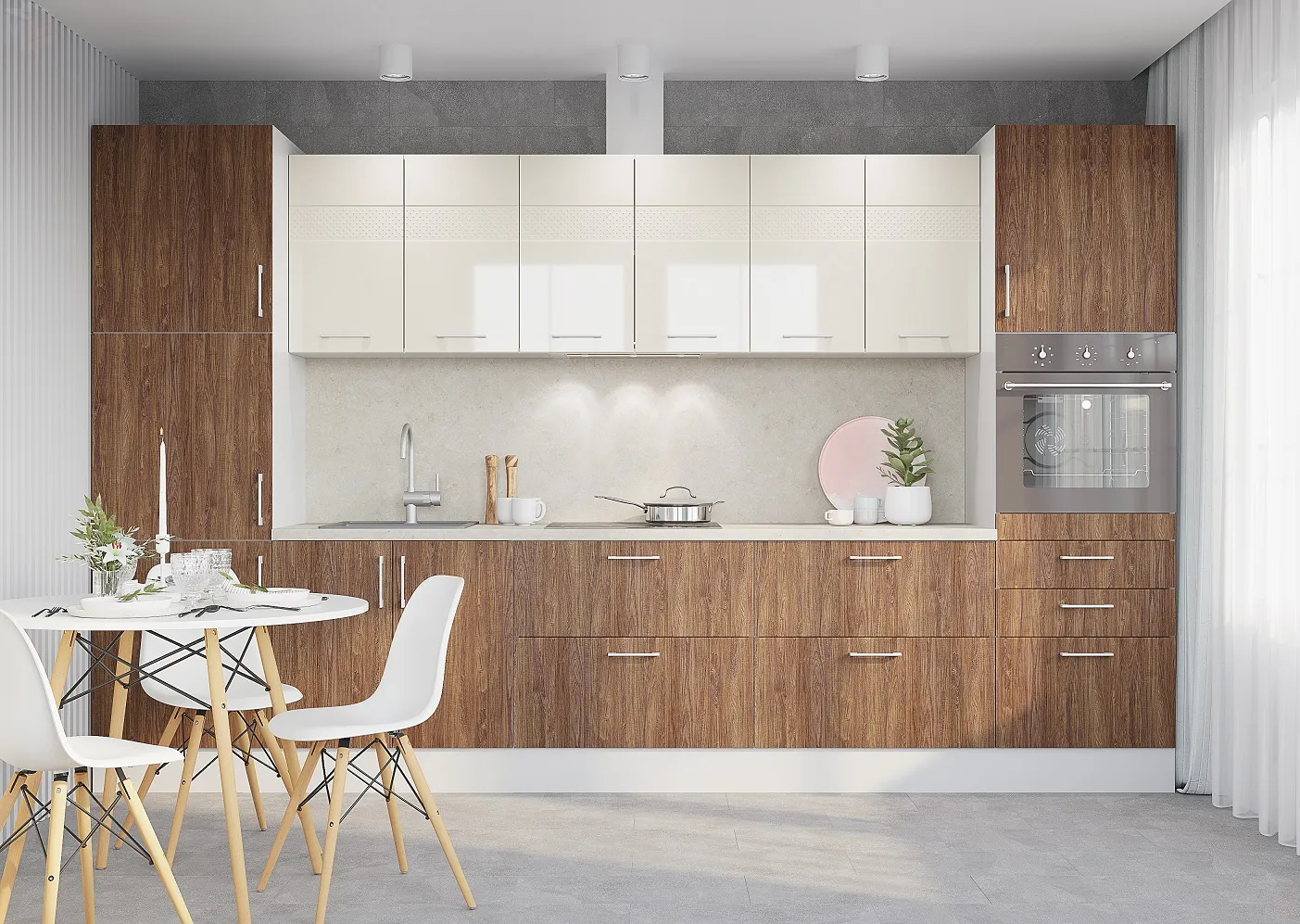 Корпус кухни выполнен из ЛДСП белого цвета, фасады: ЛДСП. Цвет фасадов - ЛДСП Мореное дерево, МДФ Ваниль глянец.
