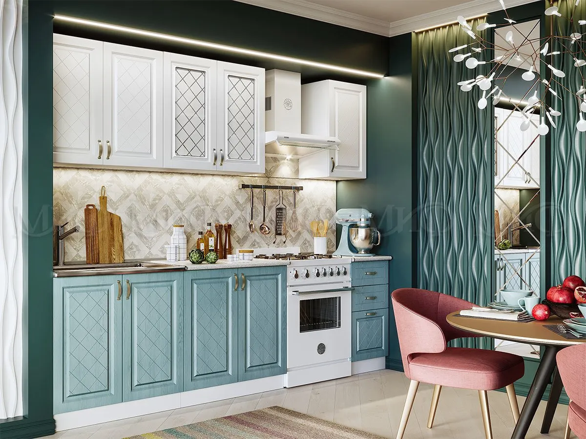 Корпус кухни из ЛДСП, фасады МДФ верх белый, низ голубой. Ручки сталь.