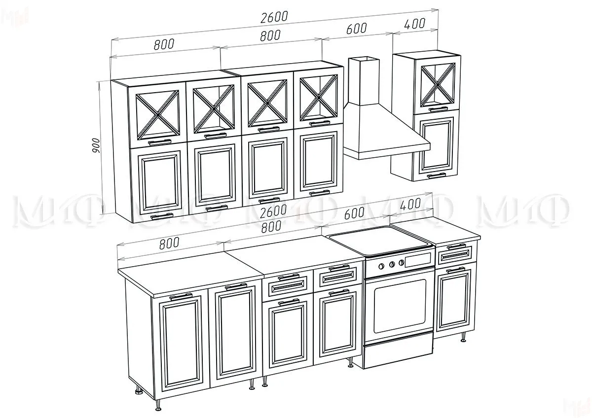 6) Верхний шкаф с одной полкой: ширина 400 мм, глубина 300 мм, высота 900 мм) Столешница входит в стоимость на все модули, кроме модуля под мойку. Мойка, сушилка приобретается дополнительно.