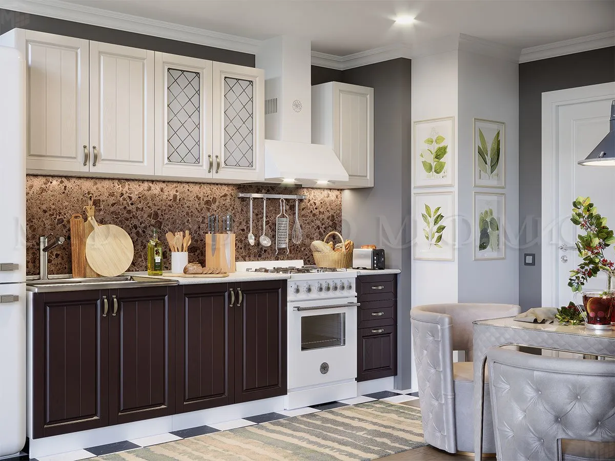 Корпус кухни из ЛДСП, фасады МДФ цвет жемчуг/шоколад. Ручки сталь.