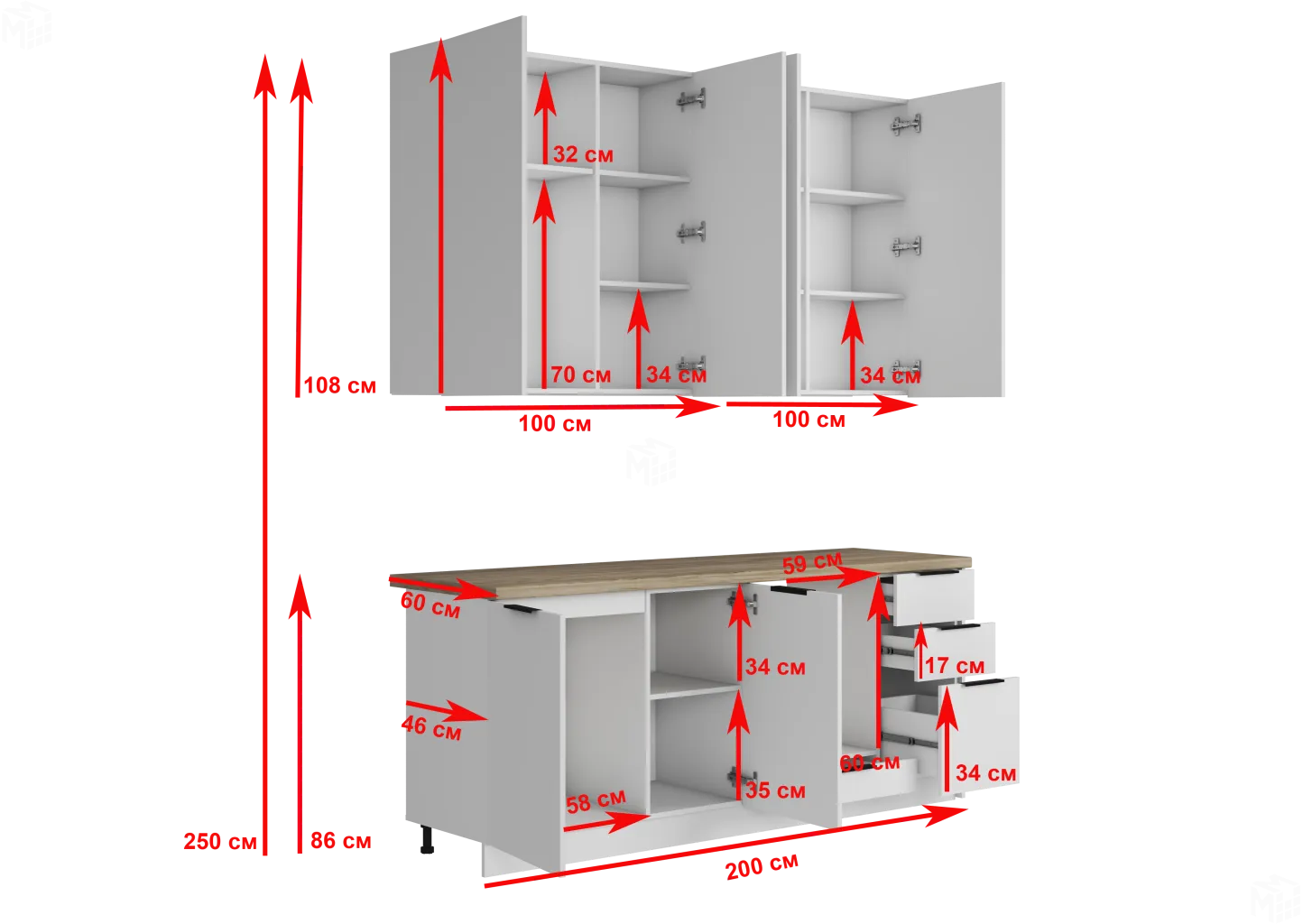 Высота верхних шкафов 1080мм.