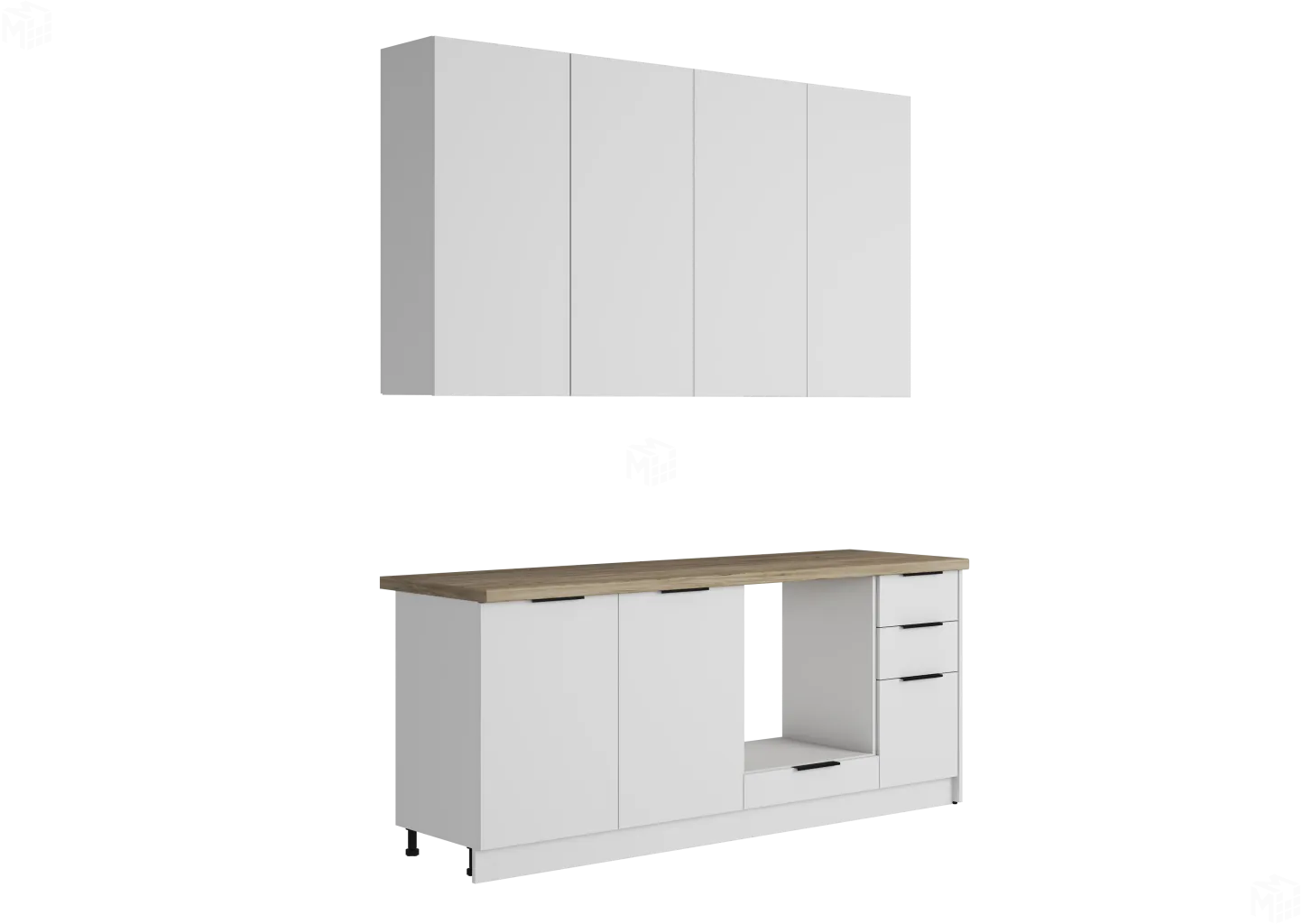 Открывание верхних шкафов осуществляется путём захвата за счёт увеличенных по высоте фасадов относительно самого корпуса.