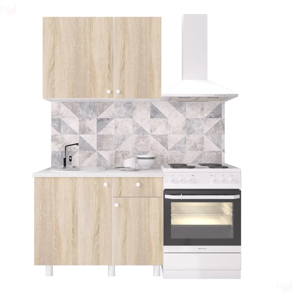 Кухонный гарнитур состоит из стола шириной 1000 мм, он поделен на 2 части - шириной 60 см с дверкой и шириной 40 см с ящиком и дверью. В гарнитур также входит верхний шкаф общей шириной 1000 мм, разделен на два отделения 60 и 40 см.