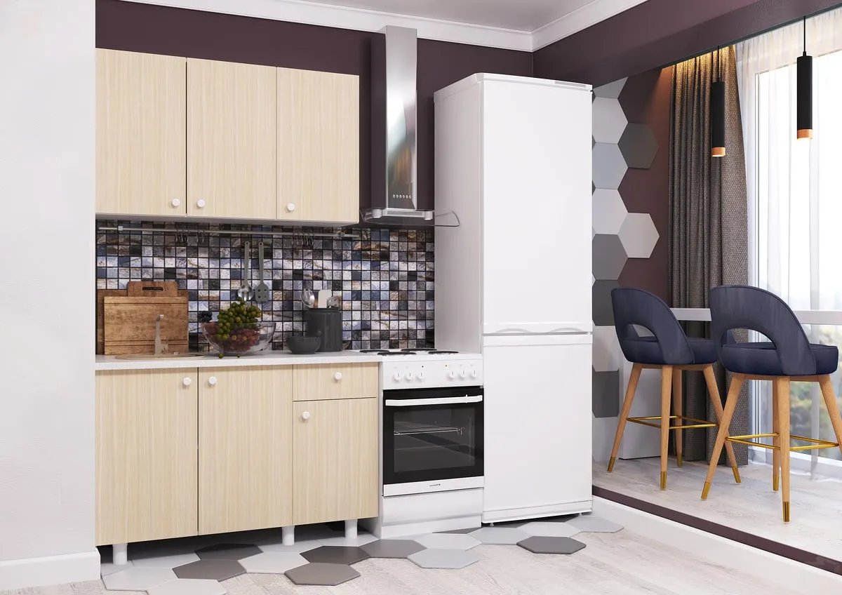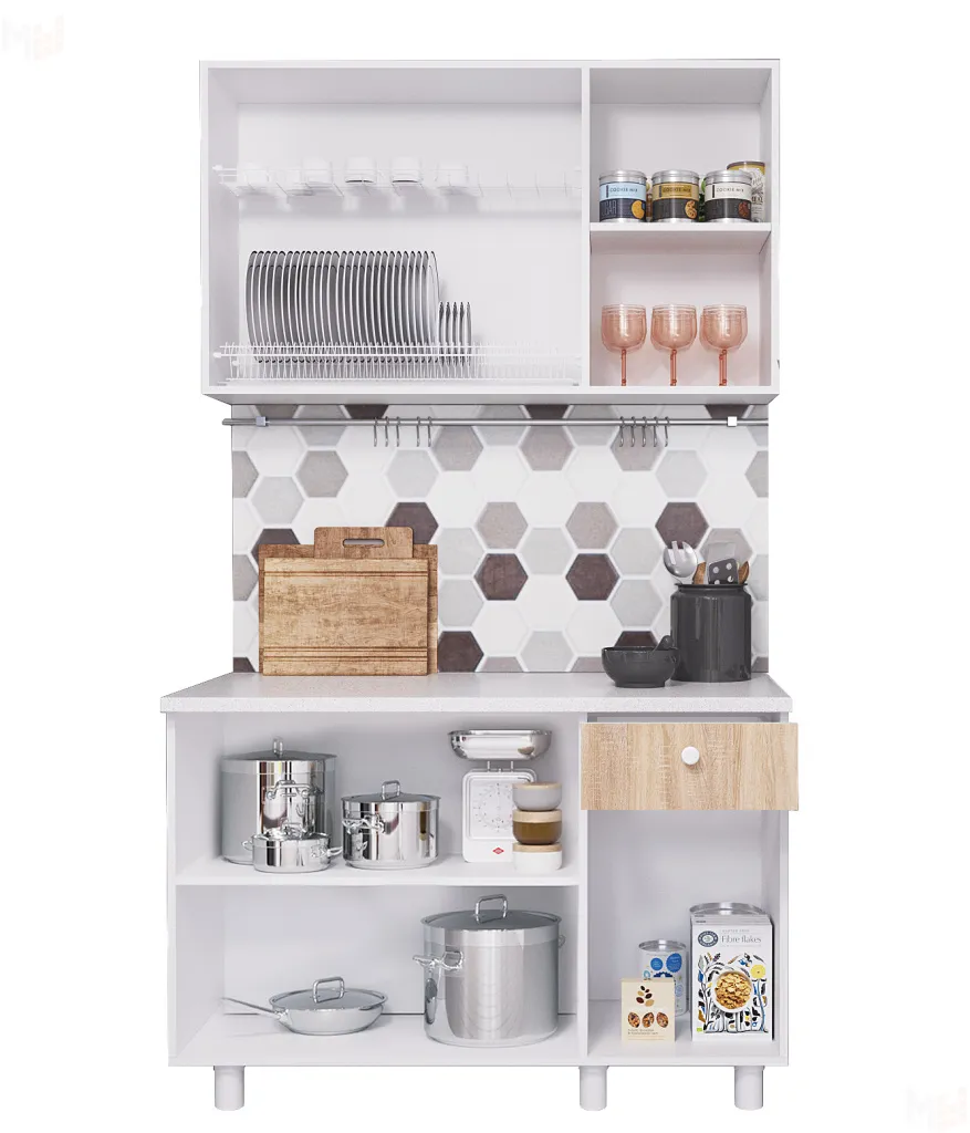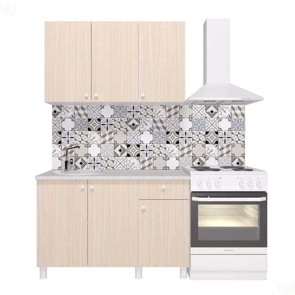 Кухонный гарнитур состоит из стола шириной 1200 мм, он поделен на 2 части - шириной 80 см с двумя дверками и шириной 40 см с ящиком и дверью. В гарнитур также входит верхний шкаф общей шириной 1200 мм, разделен на два отделения 80 и 40 см.