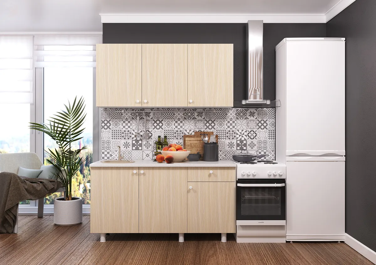 Кухонный гарнитур состоит из стола шириной 1500 мм, он поделен на 2 части - шириной 100 см с двумя дверками и шириной 50 см с ящиком и дверью. В гарнитур также входит верхний шкаф общей шириной 1500 мм, разделен на два отделения 100 и 50 см.