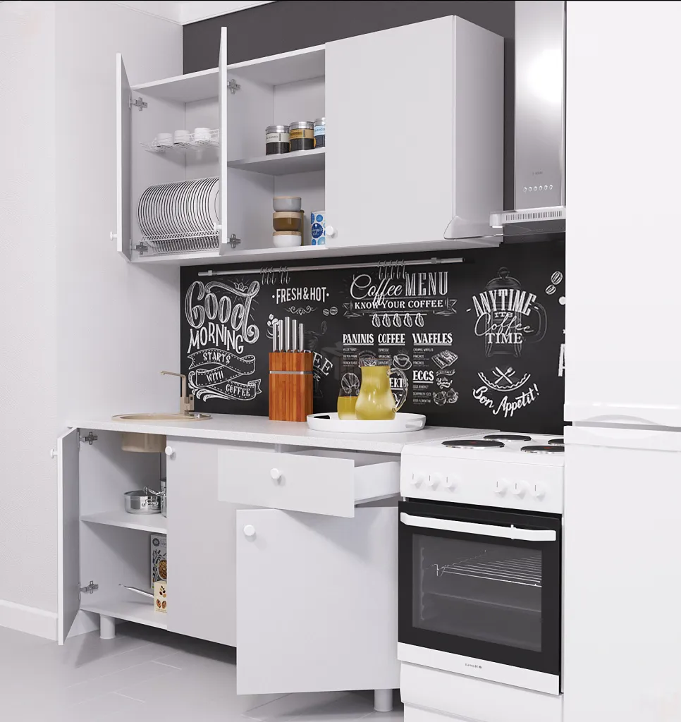 Столешница входит в стоимость. Сушилка для посуды, мойка, плинтус, стеновая панель приобретается дополнительно. -