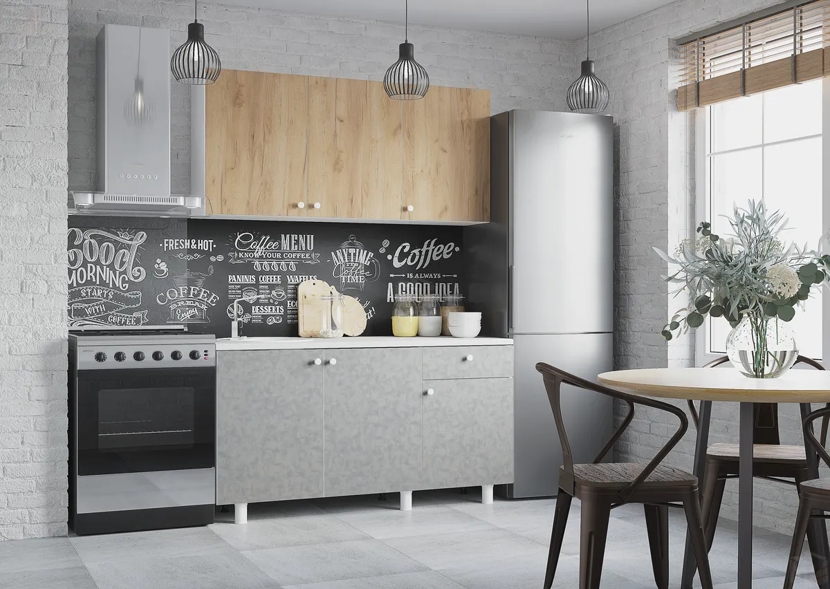Кухонный гарнитур состоит из стола шириной 1500 мм, он поделен на 2 части - шириной 100 см с двумя дверками и шириной 50 см с ящиком и дверью. В гарнитур также входит верхний шкаф общей шириной 1500 мм, разделен на два отделения 100 и 50 см.