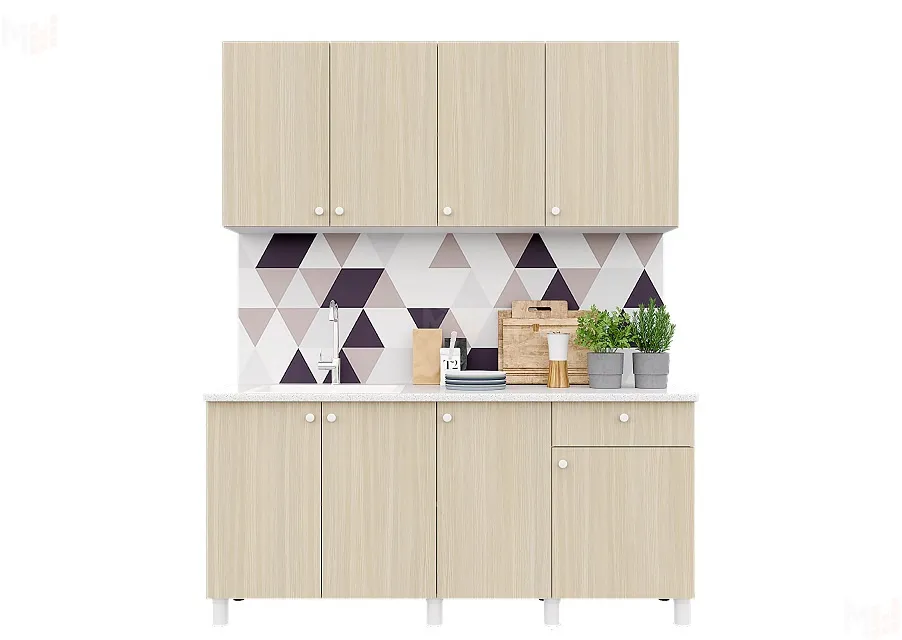 Кухонный гарнитур состоит из стола шириной 1700 мм, он поделен на 3 части - шириной 80 см с двумя дверками, шириной 50 см с ящиком и дверью, 40 см с дверью. В гарнитур также входит верхний шкаф общей шириной 1700 мм, разделен на три отделения 80, 40 и 50 см. Помодульно гарнитур не разделяется!