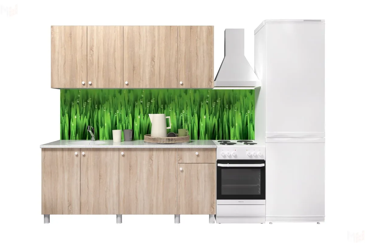 Кухонный гарнитур состоит из стола шириной 1800 мм, он поделен на 3 части - шириной 80 см с двумя дверками, стол 60 и стол 40см с ящиком и дверью. В гарнитур также входит верхний шкаф общей шириной 1800 мм, разделен на три отделения 80, 60 и 40 см.