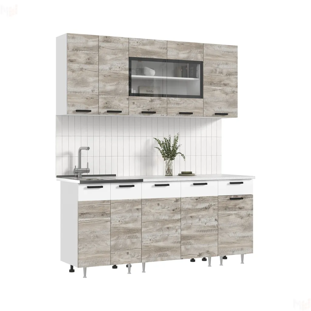 Каркас кухни выполнен из ЛДСП белого цвета. Фасады ЛДСП Дуб юкон/вставки ЛДСП Белый.