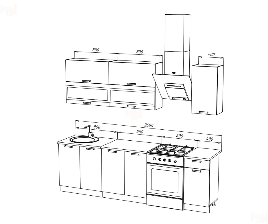 Глубина нижних столов по столешнице 600 мм. В стоимость гарнитура входят столешницы 800 и 400 мм.