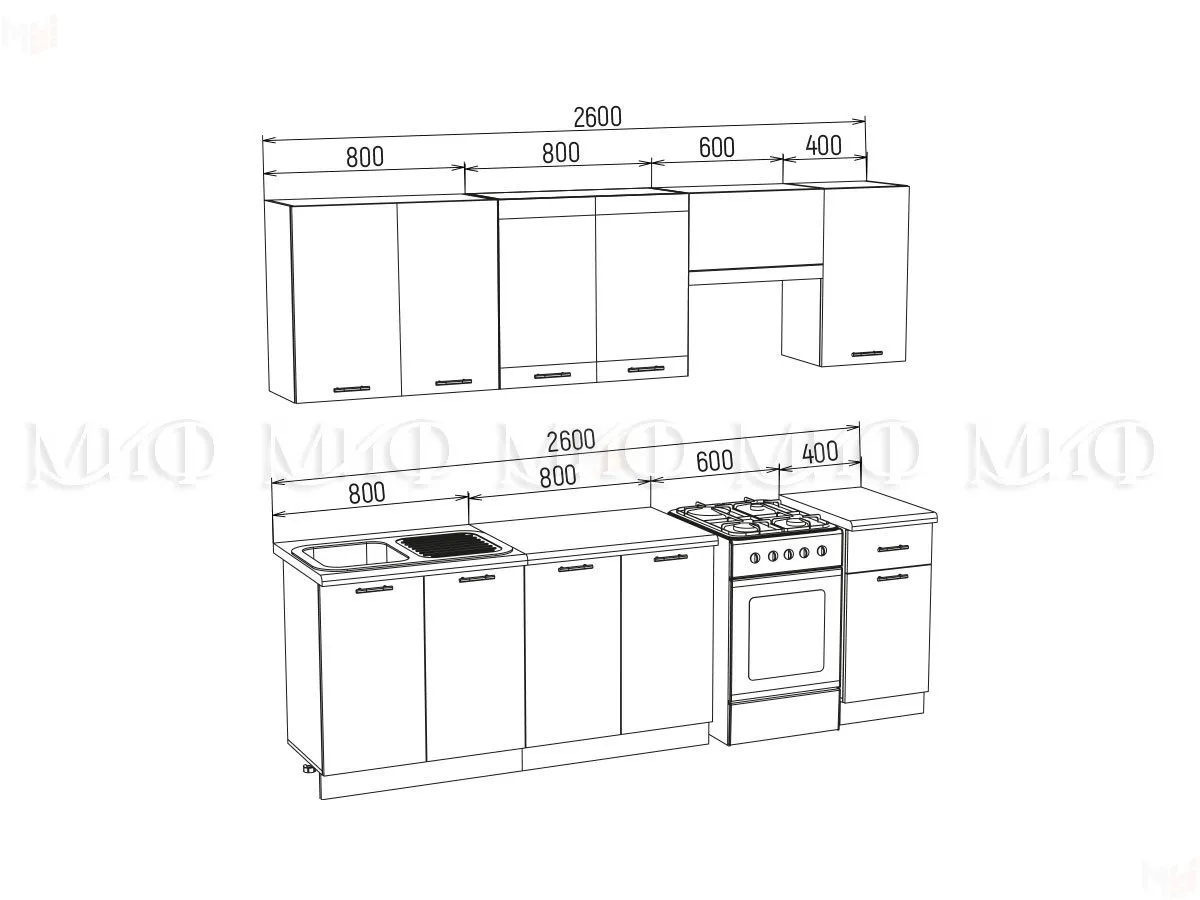 Глубина нижних столов по столешнице 600 мм. В стоимость гарнитура входят столешницы 800 и 400 мм.